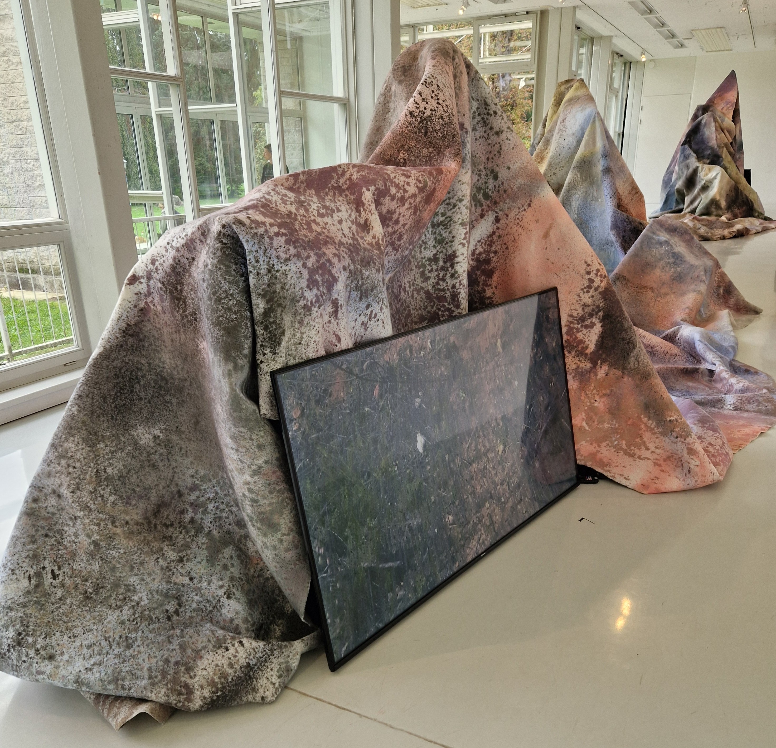 Der Ausstellungsraum wird von der Skulptur „Verfluchtes Vlies“ von Paulina Semkowicz beherrscht, die sich von einem bis zum anderen Ende des Raumes zieht und einen Gebirgszug nachahmt. Sie besteht aus Gletschervlies, das im Sommer verwendet wird, um das Schmelzen der Gletscher zu verlangsamen. Normalerweise werden dafür paradoxerweise Materialien aus der Petrochemie verwendet, dieses besteht aus naturnahen und recyclebarem Material. Im Gegensatz zum weißen Original ist das Vlies tarnfarbenartig bemalt als textiles Abbild einer schmelzenden Gletscherlandschaft und bildet so eine Gebirgsstruktur, in die sich andere Teile der Ausstellung einbetten oder darum drapiert sind. Im Gebirge selbst befinden die Videoarbeiten von Marwa Arsanios, Fiston Mwanza Mujila und von Rose-Anne Gush und Philipp Sattler.