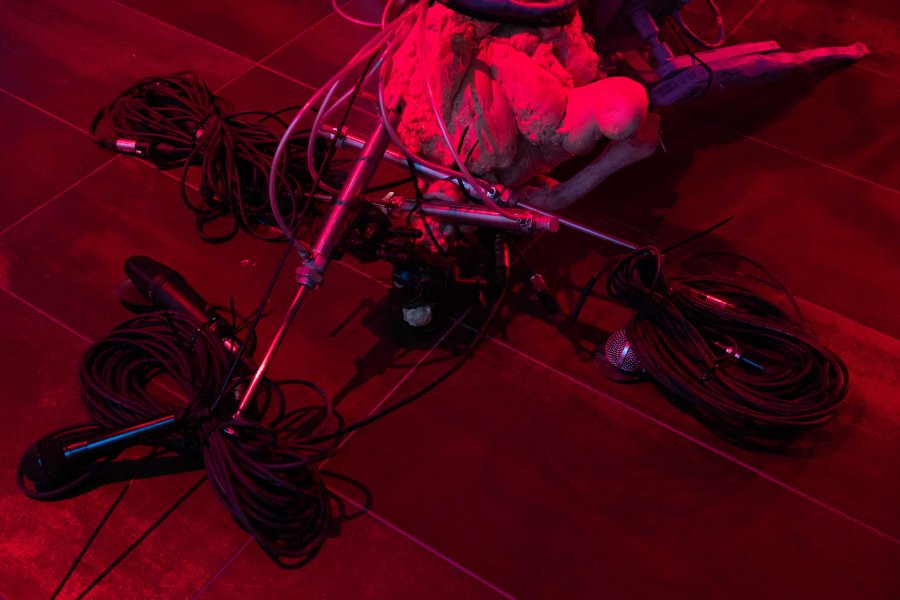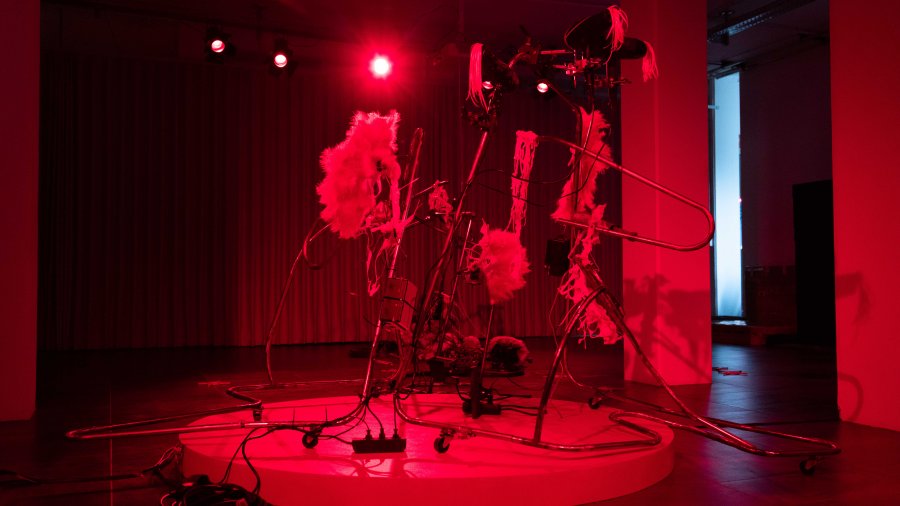 Das Hauptobjekt selbst wurde von dem Künstler vor Ort entwickelt, wobei eine fortwährende Reduktion der Produktionsphase stattfand. Bewusst gefertigt aus billigen Elementen wie Haartrocknern, Metallgestängen und Ventilatoren, liegt es im Raum – ein vordergründig mechanisches, archaisches Flickwerk, als wäre es einem dystopischen, postapokalyptischen Film entnommen. Es repräsentiert einen Körper, der zufällig regelmäßig in Bewegung gerät, als ob sich sein Ende, sein Tod als immerwährend wiederkehrender Moment, als ein letztes explosionsartiges Zucken ständig wiederholt. Die Bewegungen im Luftstrom der Harrtrockner und Ventilatoren werden in tiefes rotes Licht gehüllt, zugleich verstörend und bedrohlich, jedoch in der Offenheit, in der alles bis in kleinste Detail sichtbar ist, anziehend. Der Moment, in dem sich das Objekt in Bewegung setzt, lässt immer wieder aufschrecken, weil er von einer lauten Geräuschkulisse aus Druckluft und Haartrocknern begleitet wird, die den hypnotischen ständigen Hintergrundklang übertönt.