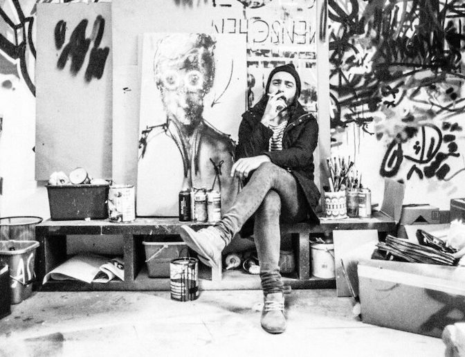 Am Taggergelände, zwischen Schlachthof und Sturzplatz, in unmittelbarer Nachbarschaft zur Ateliergemeinschaft Schaumbad hat der aufstrebende Künstler Georg Dinstl seit diesem Jahr ein Atelier der Stadt Graz bezogen. Noch handelt es sich um einen Prekariumsvertrag, der jeden Moment gelöst werden kann. Das Bewerbungsverfahren für einen fixen Platz in dem hellen und freundlichen Haus, in dem Kunstschaffende zu einem günstigen Preis einen Arbeitsplatz von der Stadt mieten können, ist derzeit am Laufen. Georg Dinstl macht sich aber keine großen Sorgen. Zu sonnig ist sein Gemüt – zu entspannt seine Lebenshaltung. Der Musiker, Street-Artist und Grafikdesigner ist schon öfter mit seinem Atelier umgezogen, hat mehrmals die Branche gewechselt. Die Lust und Freude am Gestalten ist aber geblieben und treibt ihn an. „Es muss einfach raus. Früher habe ich die Zeitung gelesen und mich darüber geärgert, was in und mit der Welt passiert, und die Songtexte rausgeschleudert. Jetzt ist es halt nicht mehr die Stimme, sondern der Pinsel, mit dem ich das ausdrücke“.