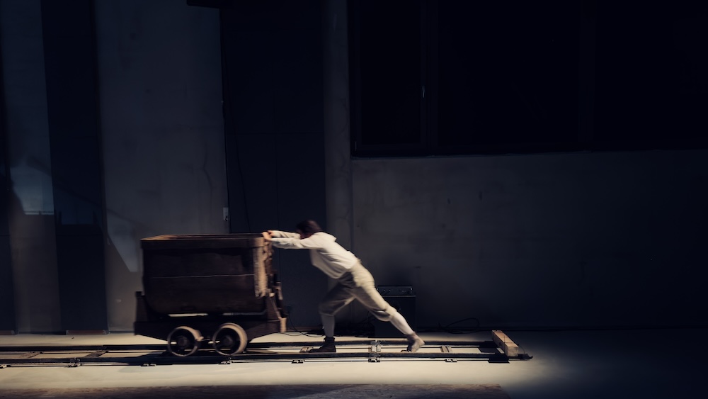 Ein historischer Grubenhunt auf Schienen, den das Montanmuseum Graz zur Verfügung gestellt hat, sowie graues Gestein, das dann und wann von Hand geschlagen wird, verstärken die Anmutung einer kargen, von harter Arbeit geprägten Welt. Das Zuhause der Figuren wird dagegen mit wenigen Mitteln markiert, vor allem durch eine einfache Holzbank, auf die Rudolf seine Frau Aloisia im Laufe des Abends immer wieder einlädt: „Mogst di net a bissl hersetzen?“ Und wenn die beiden später eng ineinander verschlungen auf dieser viel zu kleinen Bank gemeinsam einschlafen, wirkt das erstaunlicherweise weniger grotesk als innig. Die Kostüme von Sigrid Dreger unterstützen diese reduzierte Ästhetik und bleiben bewusst nah an der Realität einer alltäglichen Arbeitswelt.