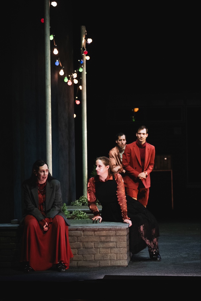Die ratlose Panik und hektische Verlorenheit, die sich unter Menschen, die mit einer Krise konfrontiert sind, ausbreitet, erinnert an wohlbekannte Szenen.Wohlfühlstück ist „Die Nebel von Dybern“ keines, das wird gleich zu Beginn klar. In einer anfangs harmlosen Unterhaltung unter bunten Glühbirnen werden die Zutaten für das Unglück eingeführt. Eine Chemiefabrik, in der alle arbeiten, eine gekaufte oder einfach feige Zeitung und scheinbar grundlos verendete Nutztiere auf der Weide, zu denen sich langsam auch Menschen gesellen sollen. Miriam Draxl hat die Darsteller*innen mit einem Make-up versehen, das sie trotz der schön durchgetakteten Kleider in Rost und Altrosa so aussehen lässt, als wären sie soeben dem Kanal entstiegen. Ob Arbeiter, Luxusweibchen, Ingenieur oder Krankenschwester: Gelber Teint und fettige Haare vermitteln durchgehend Ungesundheit. Durch geschickt eingesetztes Licht wirkt es, als wäre über allem eine Patina aus feiner Asche gelegt. Oder eben Dunst.