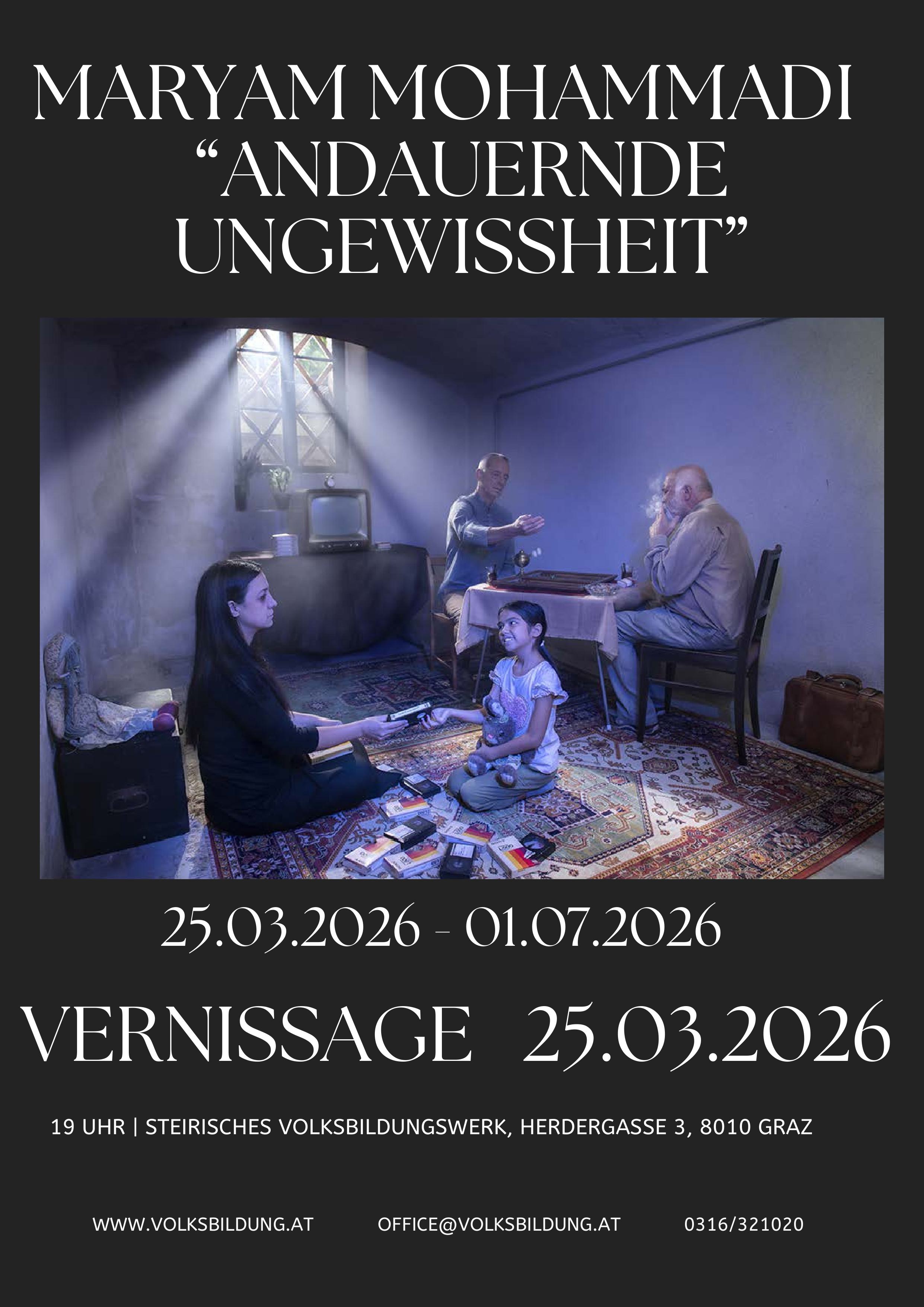 Steirisches Volksbildungswerk | Graz | AusstellungHeute | Jetzt geöffnet | 25.03.2026 - 01.07.2026Ausstellung „Andauernde Ungewissheit“ der Künstlerin Maryam MohammadiMaryam Mohammadi lebt und arbeitet seit 2009 als freischaffende Fotokünstlerin und Kuratorin in Graz.Mehr erfahren